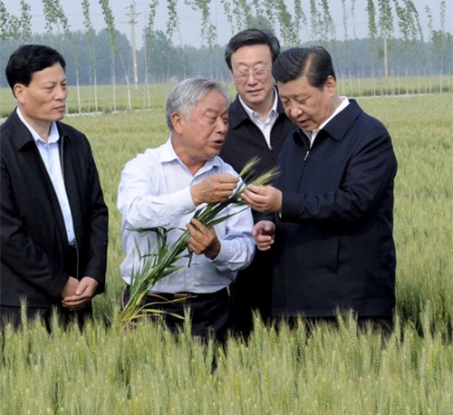 習(xí)近平在尉氏縣張市鎮(zhèn)高標(biāo)準(zhǔn)糧田察看小麥長勢。(圖片來源:新華視點(diǎn))