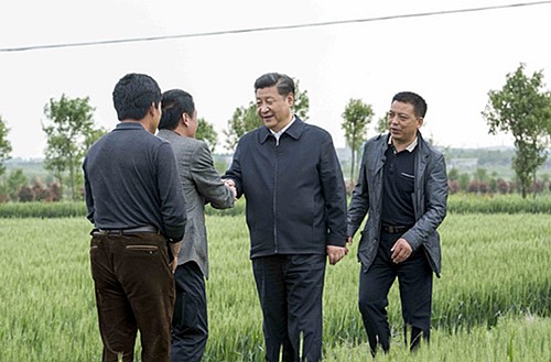 總書記來到小崗村4300畝高標(biāo)準(zhǔn)農(nóng)田示范點(diǎn),沿著田埂走進(jìn)麥田,察看小麥長勢,向村干部、種糧大戶和農(nóng)技人員了解土地流轉(zhuǎn)、農(nóng)田整理、種植品種、畝產(chǎn)量、病蟲害防治、糧食收購等情況。