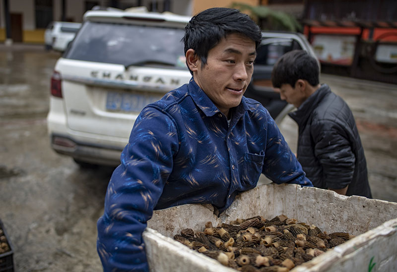 云南貢山縣獨(dú)龍江鄉(xiāng)龍?jiān)濉爸赂荒苁帧焙蜁杂涝卩l(xiāng)里賣(mài)羊肚菌(2019年4月19日攝)。新華社記者 江文耀 攝