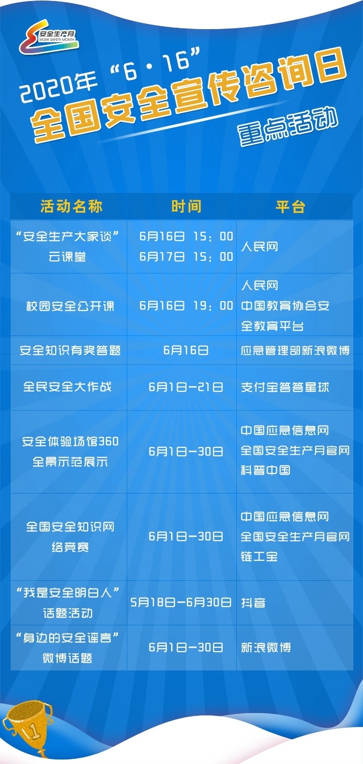 6月16日是全國安全宣傳咨詢?nèi)?,按照國?wù)院安委會辦公室、應(yīng)急管理部統(tǒng)一要求,在應(yīng)急管理部新聞宣傳司指導(dǎo)下,在人民網(wǎng)、支付寶、抖音、新浪微博、科普中國網(wǎng)等新媒體平臺,開展“安全生產(chǎn)大家談”云課堂、校園安全公開課、安全知識有獎答題、安全體驗場館360全景示范展示等系列活動,學習安全知識的同時,還可獲得各種獎品,福利多多、好處多多,詳情請關(guān)注中國應(yīng)急信息網(wǎng)和全國安全生產(chǎn)月官網(wǎng)。具體活動預(yù)告如下: