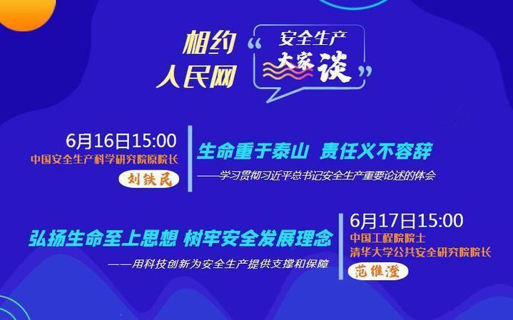 6月16日起,與知名專家、企業(yè)安全生產(chǎn)負責人和一線技術(shù)工人相約人民網(wǎng),圍繞安全生產(chǎn)責任落實、隱患排查、風險管控、應(yīng)急處置等內(nèi)容,學習安全生產(chǎn)知識技能,交流心得體會。6月16日15:00,中國安全生產(chǎn)科學研究院原院長劉鐵民,講授學習貫徹習近平總書記關(guān)于安全生產(chǎn)重要論述體會;6月17日15:00,中國工程院院士、清華大學公共安全研究院院長范維澄,講授科技創(chuàng)新保障安全生產(chǎn);其他講授內(nèi)容陸續(xù)推出。