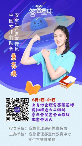 6月1日-21日,登錄支付寶答答星球開啟挑戰(zhàn)之旅,與安全達人PK安全知識,中國女排前隊長惠若琪為你加油打氣,快來參加吧!