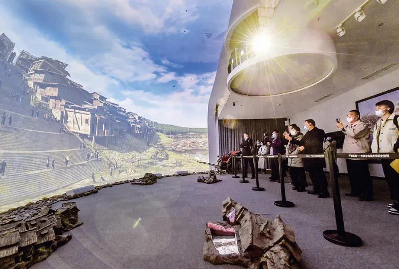 近年來,重慶紅巖革命紀(jì)念館以新技術(shù)把革命文物搬上屏幕和舞臺(tái),創(chuàng)新革命文物展示,讓紅巖革命文物“活”起來。圖為在重慶紅巖革命紀(jì)念館“紅巖記憶”數(shù)字體驗(yàn)廳內(nèi),觀眾們觀看以雙曲三維穹幕技術(shù)展示的場景。 新華社記者 李賀/攝