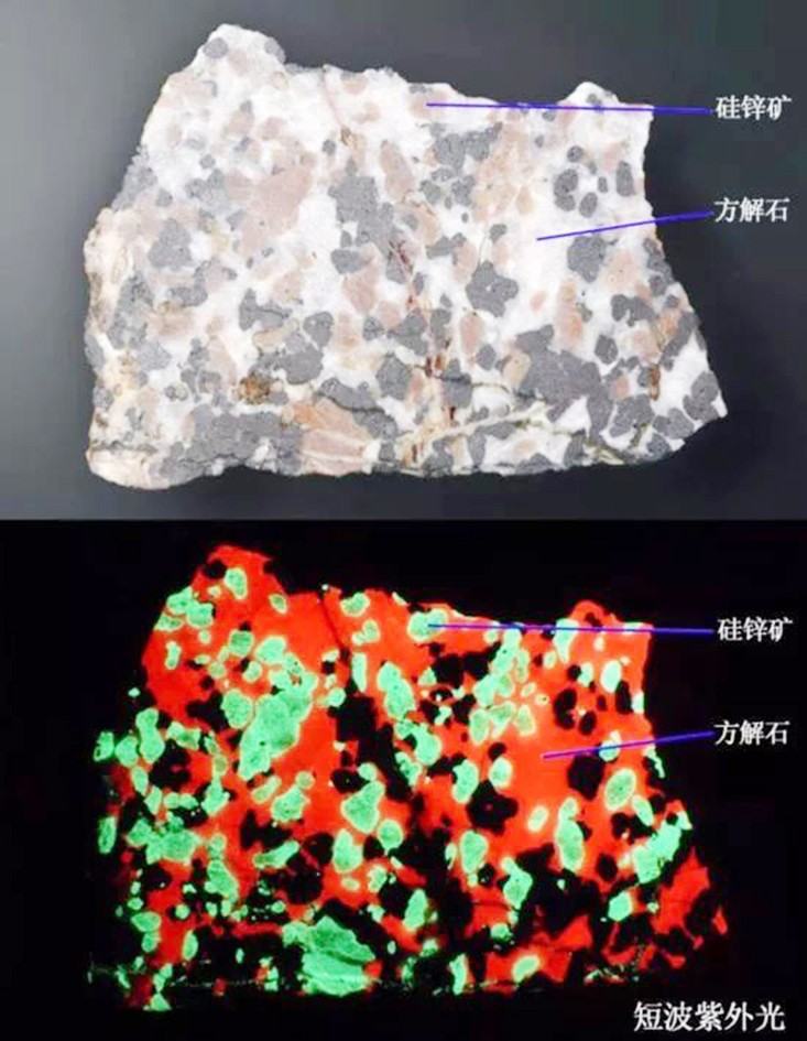 這是一種非常容易識別的含有熒光礦物的巖石,其中的兩種礦物會在短波紫外光下發(fā)出強烈的熒光:方解石(Calcite)發(fā)出紅色熒光,硅鋅礦(Willemite)發(fā)出綠色熒光。紅綠對比強烈,再加上沒有熒光的黑色鋅鐵礦(NFFranklinite),非常具有觀賞性。通常這種巖石被稱為“圣誕方解石(Christmas Calcite)”或者“瘋狂方解石(CrazyCalcite)”。