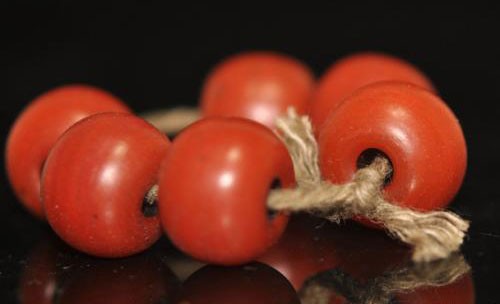 其次是質(zhì)感。南紅是膠質(zhì)感的,就算全紅的珠子也不是不透光的。即便是無色的南紅珠子,用肉眼觀察時,也會有種朦朧的感覺,類似和田玉般的油潤感。