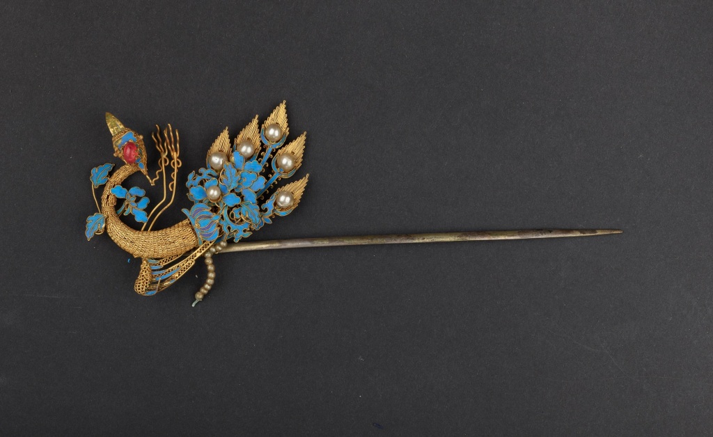 點(diǎn)翠嵌珠寶鎏金銀鳳簪,清代,孔府舊藏。銀質(zhì)鎏金;鳳形,整器以累絲和點(diǎn)翠等工藝裝飾,鑲嵌紅寶石、珍珠點(diǎn)綴?!棒ⅰ笔枪艜r(shí)漢族婦女的一種發(fā)飾,是古代婦女發(fā)型中最基礎(chǔ)的固定和裝飾工具,由“笄”發(fā)展而來的,用來綰定發(fā)髻或冠的長(zhǎng)針?!逗鬂h書·輿服志》有:“黃金龍首銜白珠,魚須擿,長(zhǎng)一尺,為簪珥”的記載。