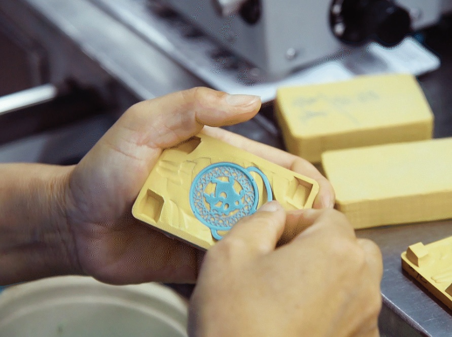 倒模工藝就是要先做一個蠟版,將每個小蠟件分層次地“種”到蠟樹干上,形成一個“蠟樹”。然后將蠟樹放入裝有石膏粉和水的鋼拎中,并用抽真空機進行抽真空,再將石膏模放入烤箱中進行烘干,除去鋼拎內(nèi)的蠟件。此時,蠟樹已經(jīng)完全融化,石膏模制作完成。
