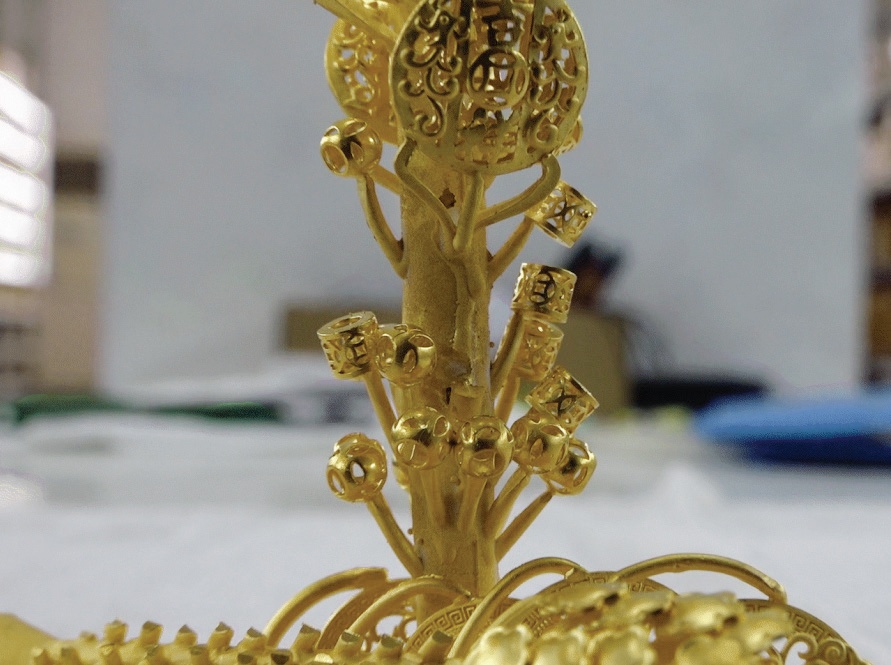 最后將“金樹”上的產(chǎn)品剪下,并對產(chǎn)品進行修整,使其達到造型優(yōu)美、表面平整。經(jīng)過表面工藝、車花、成品拋光等流程后,倒模工藝的金飾品就制作完成了。