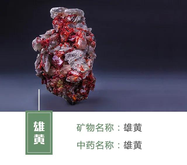 特征:雄黃單晶體呈細小的柱狀、針狀,但較為少見,通常為致密粒狀或土狀塊體。顏色呈橘紅色。
