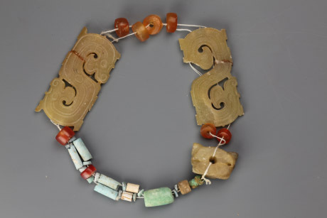 器由“S”形夔龍玉飾兩件、獸頭形玉飾一件、扁圓形瑪瑙珠九顆、長鼓形翠珠一顆、綠松石珠大小十八顆、圓柱形玉石珠兩顆串成。