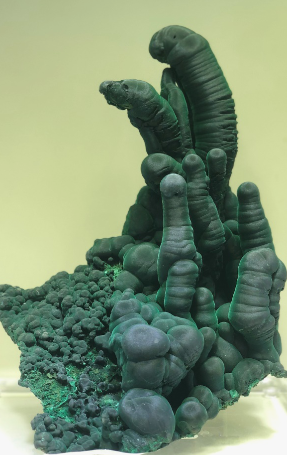 單體塊度較大的孔雀石以其各自獨特的姿態(tài),受到礦物晶體藏家喜愛,一般單體越大,價值越高,良石天成,稍加匠人雕琢,凸顯了天人合一的自然之美??兹甘瘑尉w多為細長的針狀、柱狀,集合體通常呈葡萄狀、鐘乳狀、放射狀、結核狀或同心環(huán)帶狀。我國的孔雀石主要產于廣東陽春、湖北大冶等地。廣東陽春產出的孔雀石形態(tài)多樣,鬼斧神工,奇妙至極;湖北大冶的孔雀石多為鐵銅氧化形成,質地致密,色澤濃艷,獨具特色。在中國地質博物館的展廳內,就展示了多件出自廣東陽春的精美孔雀石標本。