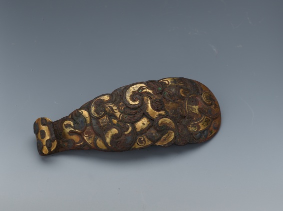 器扁寬,呈琵琶形,通體錯(cuò)金銀。獸首狀鉤,鉤面飾相互交錯(cuò)纏繞的蟠虺紋,鉤背飾卷云紋,有一釘狀鈕,鈕面飾渦紋。