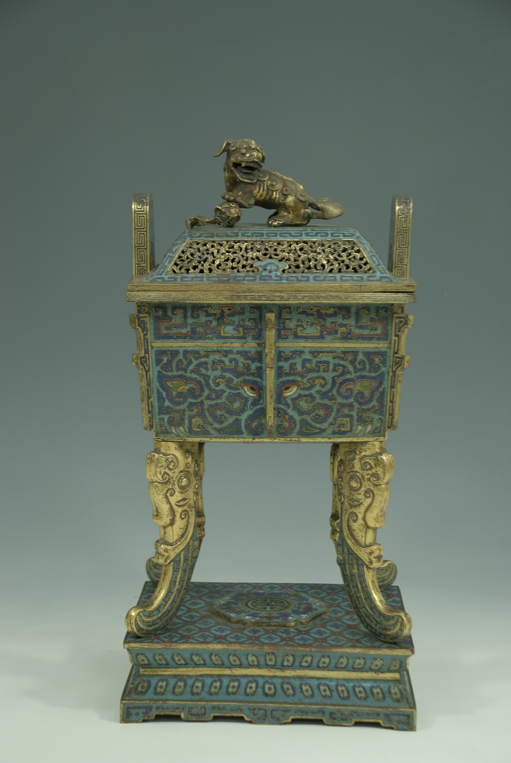 明獸面紋掐絲法瑯香爐,明代。該香爐為孔子博物館館藏一級(jí)文物“明獸面紋掐絲法瑯五供”之一,紫銅胎鍍金,器呈長(zhǎng)方形,平口、出沿,立耳,直腹,平底,獸首吞足式四足,腹及四角皆有扉棱,帶蓋。蓋頂鑄獅鈕,蓋面鏤空,蓋面飾曲帶紋。腹及耳部飾變形夔龍紋和變形獸面紋。座為長(zhǎng)方形,飾萬(wàn)字紋、蓮瓣紋、“五蝠捧壽”紋。