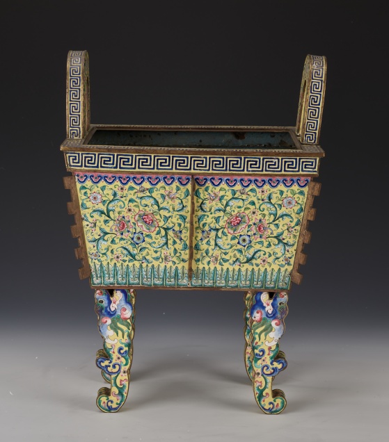 銅胎。平口,寬折沿,立耳,方腹,腹飾扉棱,平底,龍形足。外壁以黃色琺瑯釉為地,耳飾回紋、纏枝花卉紋;口沿飾回紋;腹飾如意云頭紋、纏枝花卉紋、蕉葉紋;足飾龍紋;篆書“太平御劉琦璋店建造”底款。