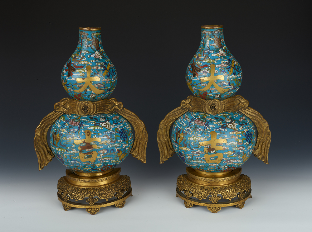 “大吉”掐絲琺瑯葫蘆瓶,明代。此對(duì)壁瓶銅胎鍍金,材質(zhì)、做工及紋飾均相同,可合二為一體。束腰飾鍍金飄帶,鏤空“福壽如意”紋銅座,如意云頭形足;以淺藍(lán)色琺瑯釉為地,上部飾暗八仙紋,下部飾八吉祥紋,間飾朵云紋,上、下腹中心鎏金楷書“大”“吉”二字。