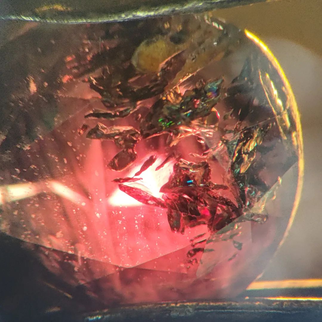 答:該顆托帕石經(jīng)過了覆膜處理,而刻面棱線處更容易受到磨損,因此棱線處出現(xiàn)顏色缺失。