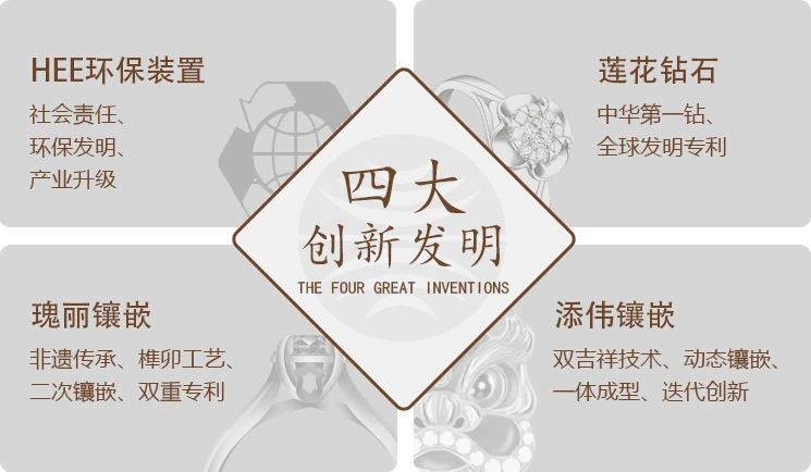創(chuàng)新發(fā)明“HEE環(huán)保裝置”、“蓮花鉆石”、“瑰麗鑲嵌”、“添偉鑲嵌”等技術獲得多項全球發(fā)明專利,并入選教材《珠寶玉石學》和《商業(yè)首飾設計》中國珠寶品牌案例。