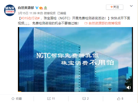 珠寶國檢(NGTC)助你維權(quán)系列報(bào)道(十一)丨“3.15NGTC在行動(dòng)·助你維權(quán)”視頻短片獲自然資源報(bào)推薦登錄自然資源部官方微博