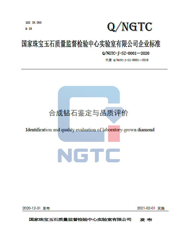 2020年12月30日,自然資源部珠寶玉石首飾管理中心(國家珠寶玉石質(zhì)量監(jiān)督檢驗(yàn)中心)(下簡稱珠寶國檢NGTC)發(fā)布Q/NGTC-J-SZ-0001—2020 《合成鉆石鑒定與品質(zhì)評價(jià)》,代替了珠寶國檢(NGTC)在2019年發(fā)布并實(shí)施的企業(yè)標(biāo)準(zhǔn),并于2021年2月1日正式實(shí)施。2021年2月5日,珠寶國檢(NGTC)獲批檢測能力范圍覆蓋新?lián)Q版的標(biāo)準(zhǔn)內(nèi)容,可以對外開展相關(guān)業(yè)務(wù)。