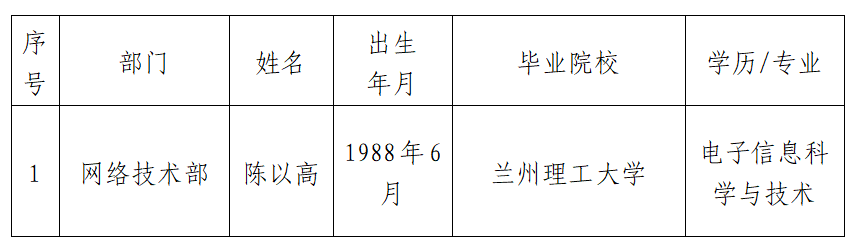 按照自然資源部珠寶玉石首飾管理中心招聘工作方案要求,經(jīng)過發(fā)布招聘公告、資格審查、面試、體檢等程序,經(jīng)黨委會(huì)議研究,擬聘用陳以高同志為網(wǎng)絡(luò)技術(shù)部工作人員,現(xiàn)予以公示。