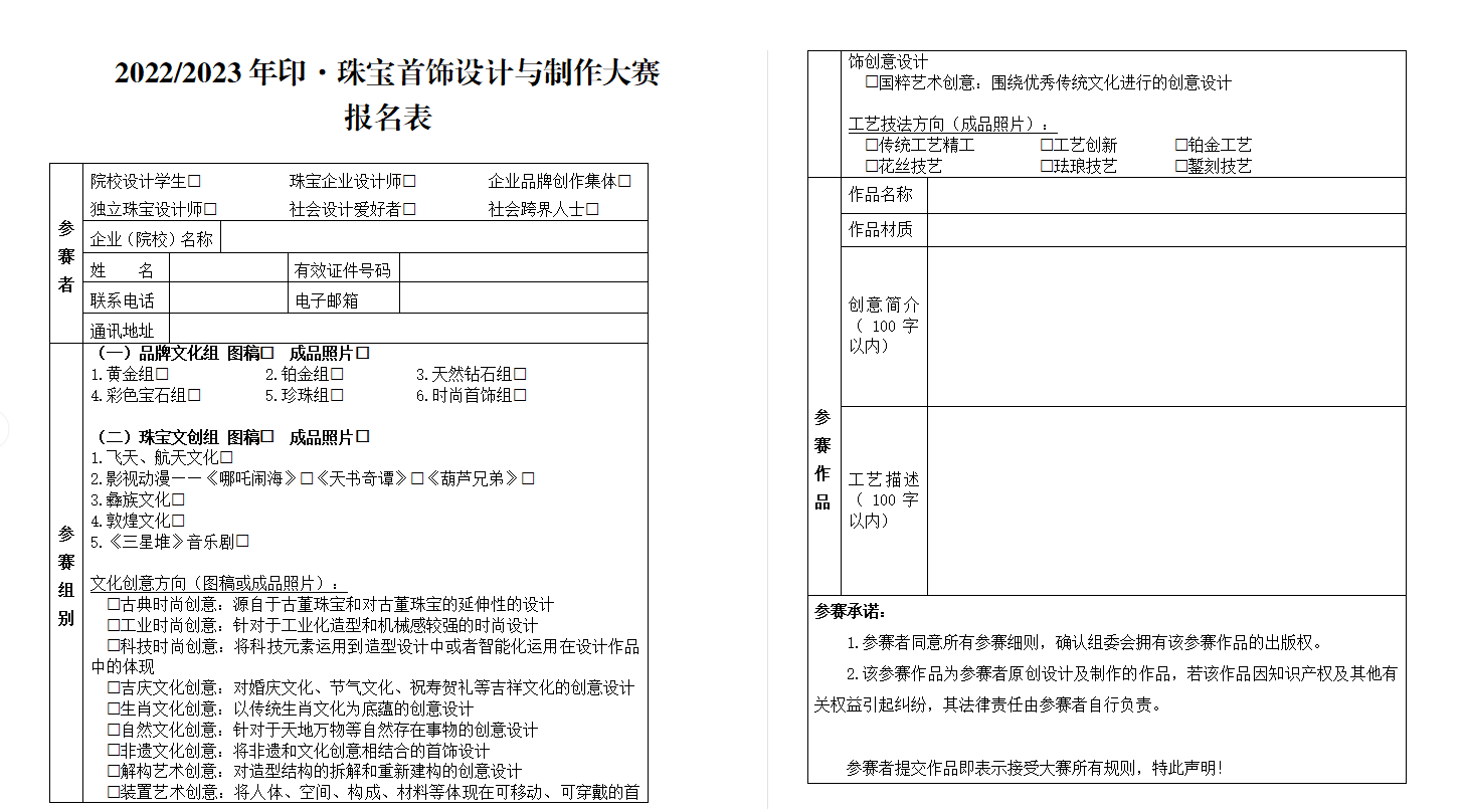 2022/2023年印·珠寶首飾設計與制作大賽報名表