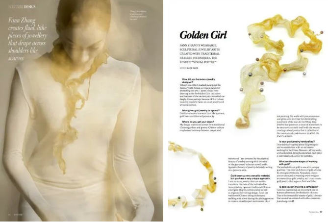 國外很多媒體對(duì)這個(gè)系列的作品特別感興趣,大家也在探討什么是新時(shí)代的奢侈品,其實(shí)它不僅僅是材料的名貴,還要有地域的文化特征,以及把各地域的傳統(tǒng)文明轉(zhuǎn)化成現(xiàn)代文明的設(shè)計(jì)手法。在整個(gè)系列作品的制作過程中,我也考慮了珍珠和人之間的搭配關(guān)系。因?yàn)檎渲楸旧聿⒉幌裼行毷敲磽屟郏軠貪?、很柔和,所以其?shí)它自己本身有很好的保護(hù)屬性,能夠幫助形成非常好的人與自然之間的鏈接關(guān)系。